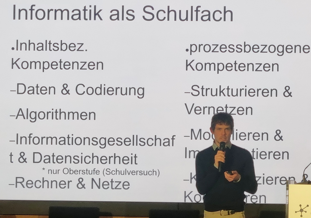 Christoph Michl, Lehrbeauftragter für Didaktik der Informatik an der Universität Ulm und Informatiklehrer am Joachim-Hahn-Gymnasium Blaubeuren, berichtete aus der Praxis. Informatikunterricht müsse Neugier wecken und Problemlösungskompetenz fördern. Es gehe nicht nur ums Programmieren, sondern um Denken in Systemen. Allerdings sei nach wie vor das Fach Informatik im Lehrplan im Vergleich zu anderen Lehrfächern völlig unterrepräsentiert. Dass Informatik einen höheren Stellenwert in den Klassenzimmern erhält, sei eine langfristige Aufgabe, die vielfältige Bereiche im Schulsystem betreffe und entsprechend schwerfällig umgesetzt werde.