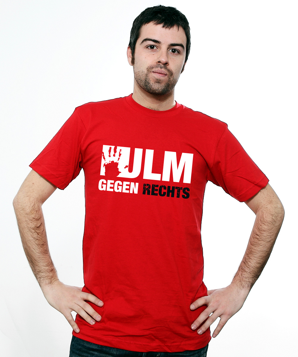 Mit Ulm gegen Rechts-Motiven auf dem T-Shirt haben die Gegner des NPD-Aufmarsches am 1. Mai in Ulm nun die Möglichkeit, eindeutig Stellung zu beziehen. Die T-Shirts mit klarer Aussage gegen Rechts gibt es jetzt in unterschiedlichen Farben und mit verschiedenen Motiven unter www.shirtcity.com/ulmgegenrechts. Farben und Motive können frei kombiniert und individuell gestaltet werden.